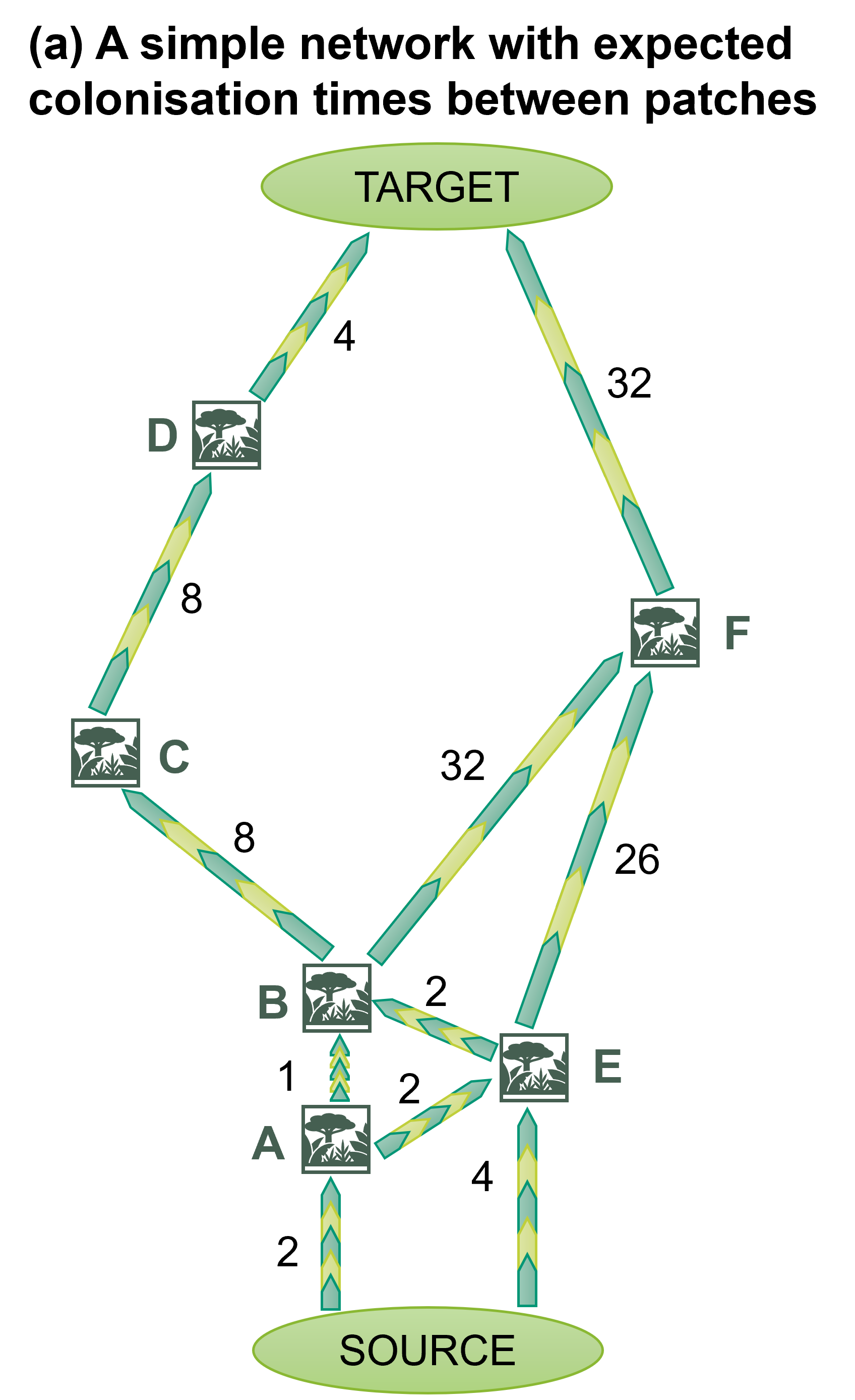 The figure below on the left, diagram (a), shows a few habitat patches linked together by waiting times. For example, the total mean time from the source to the target going via A-B-C-D is 23 generations, whereas going via E-F it takes 62 generations.