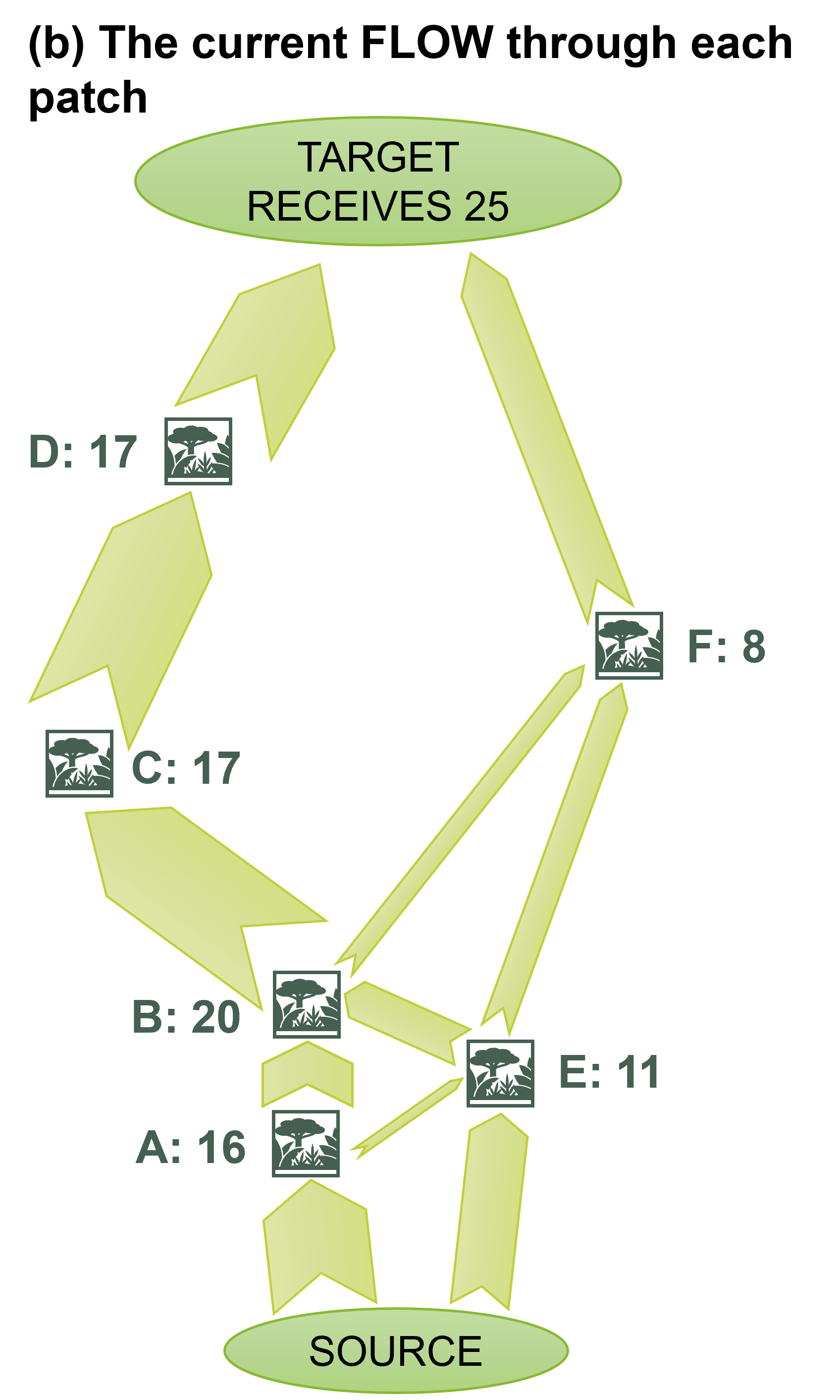 The FLOW that arises from the resistance values on the left diagram (a) is shown on the right (b). We see that patch B has the highest FLOW.